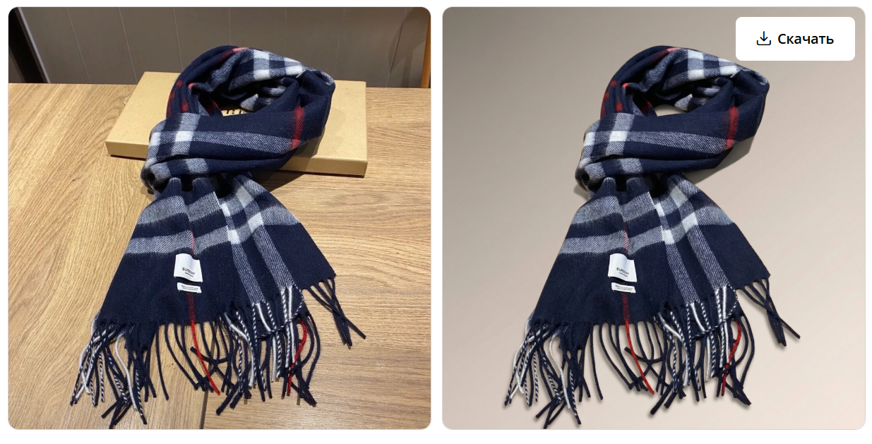 Выделить шарф с исходного изображения, убрать текущий фон и поместить на красивый студийный фон. Фон — нейтральный градиент (светлый серый или мягкий тёплый тон) с аккуратным студийным освещением. Освещение на шарфе скорректировать так, чтобы он выглядел органично на новом фоне: мягкие тени под низом, равномерные блики на ткани, без пересветов или тёмных пятен. Края объекта чёткие, без ореолов, без артефактов удаления фона. Цвет, текстура и пропорции шарфа сохранить без изменений, не накладывать стилизующие эффекты.
