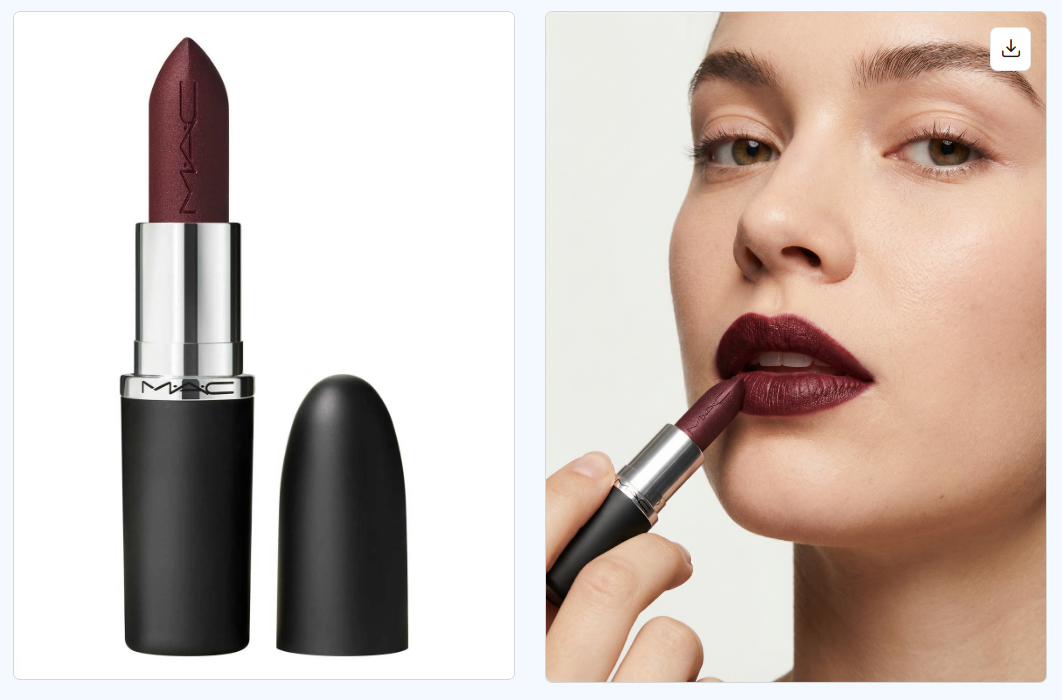 Сгенерировать фотореалистичное фото девушки, которая наносит эту помаду на губы (поза крупным планом по лицу). Сохранить форму и цвет помады из исходника, показать момент нанесения кисточкой/аппликатором на губы, естественный макияж, аккуратный свет и чистый фон. Сделать снимок в журнальном стиле, яркий фокус на лице и губах, без искажений, без изменения продукта, реалистичная текстура кожи и помады.