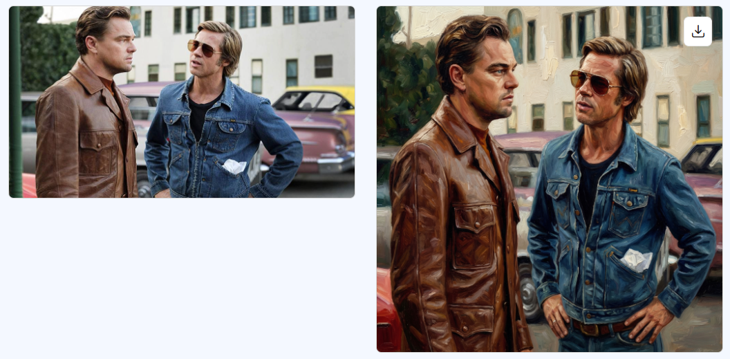 Сделай из фотографии художественную картину: преобразуй изображение в стиль реалистичной живописи, добавь текстуру мазков кисти, мягкое смешение цветов и художественные тени, сохрани лица, позы и атмосферу сцены, чтобы изображение выглядело как кинематографичная картина маслом с глубиной, деталями и эффектом классической живописи