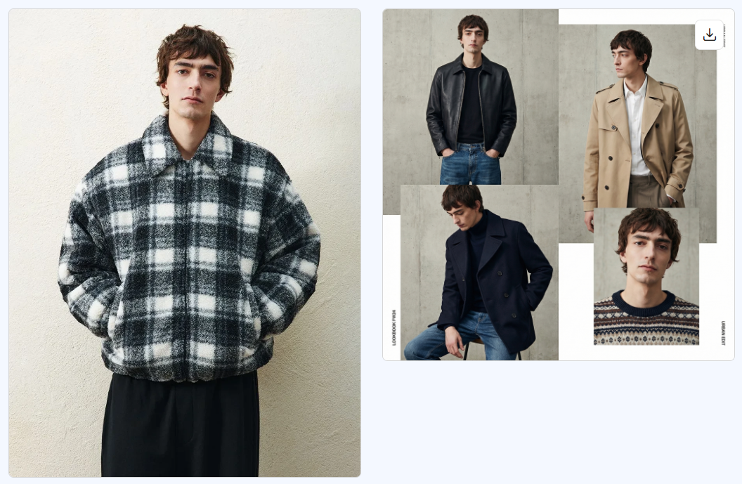 Сделай стильный коллаж из нескольких изображений этого парня: размести несколько версий одного и того же человека в разной одежде и образах, как в модной съемке, добавь разные позы и ракурсы, аккуратно расположи их на одном фоне, сохрани реалистичное освещение, высокую детализацию лица и одежды, чтобы коллаж выглядел как страница из модного журнала или лукбук бренда.