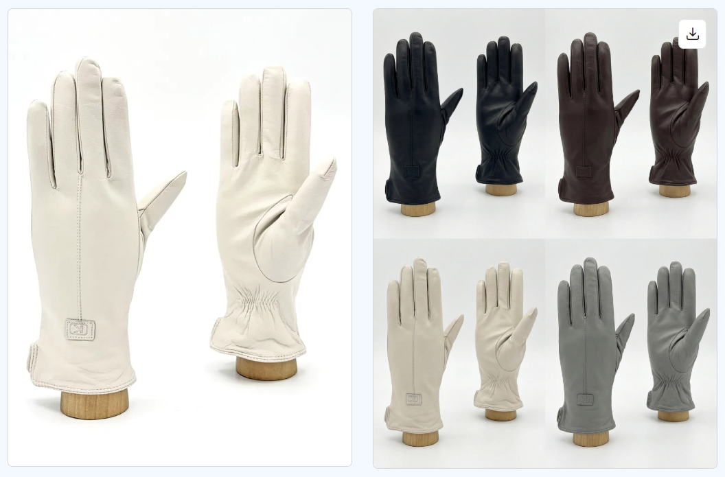 Сделай коллаж из нескольких изображений этих перчаток: покажи одну и ту же модель перчаток в разных цветах (например черный, коричневый, бежевый, серый), аккуратно размести варианты рядом на светлом фоне, сохрани одинаковый ракурс и освещение, подчеркни текстуру кожи и детали швов, чтобы изображение выглядело как аккуратный каталог или карточка товара интернет-магазина.