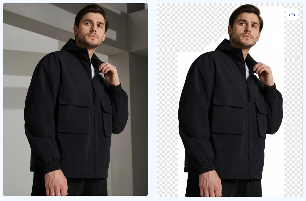 Удали фон на изображении: аккуратно вырежи мужчину в куртке, полностью убери интерьер и стены позади, сохрани естественные края одежды, волос и рук, сделай чистый прозрачный или однотонный фон, чтобы изображение выглядело как аккуратная вырезка для каталога или карточки товара.
