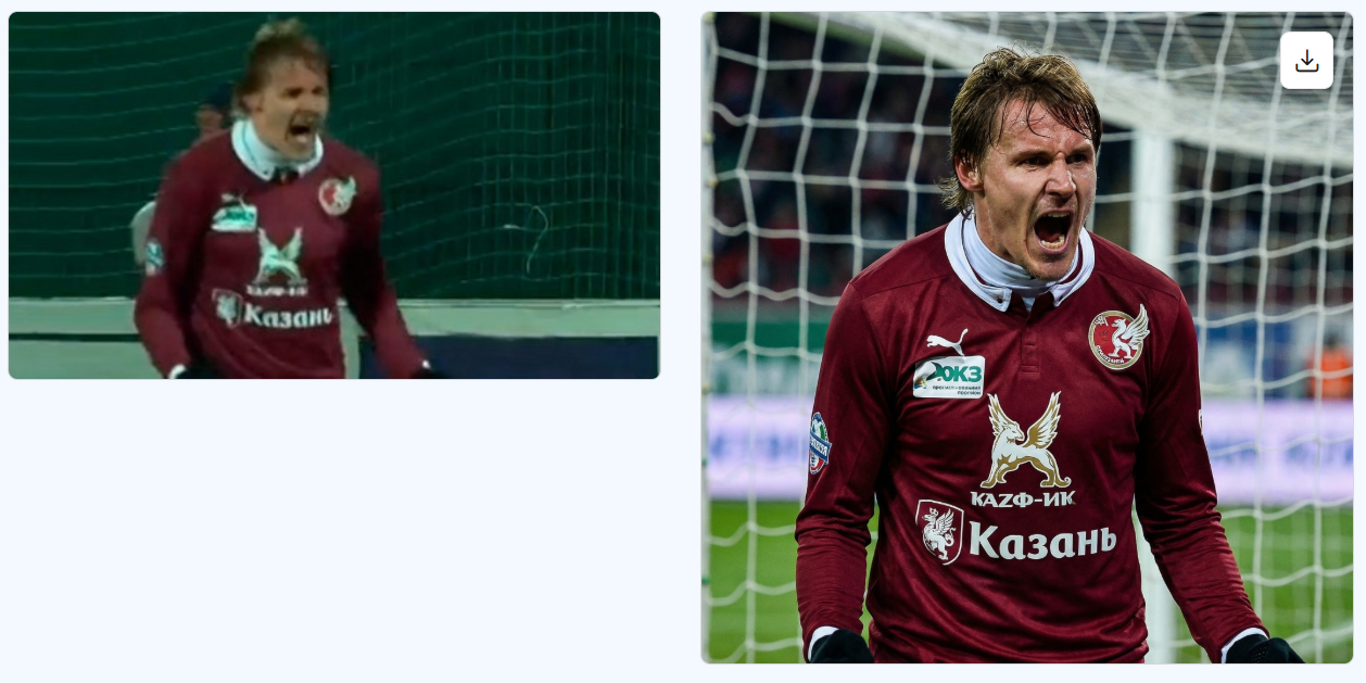 Сделай изображение более четким и качественным: увеличь разрешение, убери шум и размытость, усиль детализацию лица и формы футболиста, сделай цвета формы более насыщенными, улучшай контраст и освещение стадиона, проработай сетку ворот и фон, чтобы кадр выглядел как четкая профессиональная спортивная фотография высокого качества.