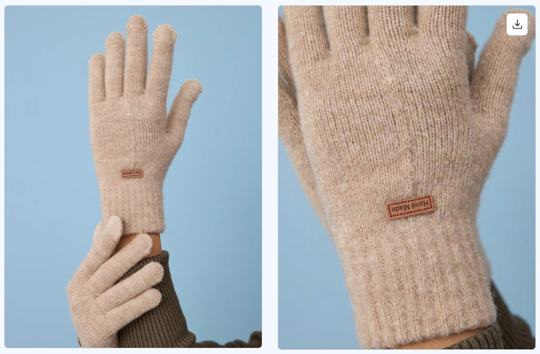 Увеличь масштаб изображения без потери качества: приблизь кадр так, чтобы перчатка занимала большую часть изображения, аккуратно обрежь лишний фон, сохрани высокую резкость и текстуру ткани, проработай вязку и детали материала, чтобы изображение выглядело как четкая крупная предметная фотография перчатки.