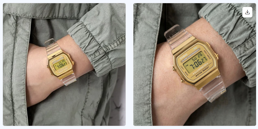 Увеличь масштаб изображения без потери качества: аккуратно приблизь кадр к запястью с часами, сделай часы главным объектом кадра, сохрани высокую детализацию корпуса, экрана и ремешка, улучшай резкость и текстуру металла и ткани рукава, чтобы изображение выглядело как четкая крупная предметная фотография часов.
