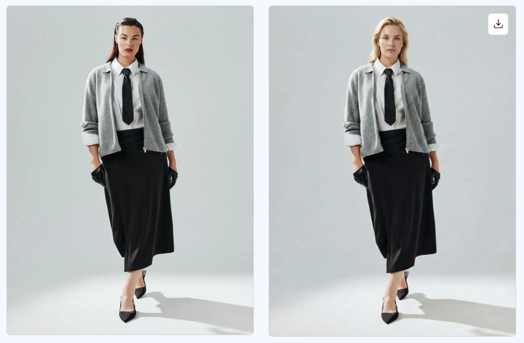 Инструмент от SELLER MOON заменяет полностью голову по описанию и подстраивает новую под тело, позу, ракурс и освещение сцены.