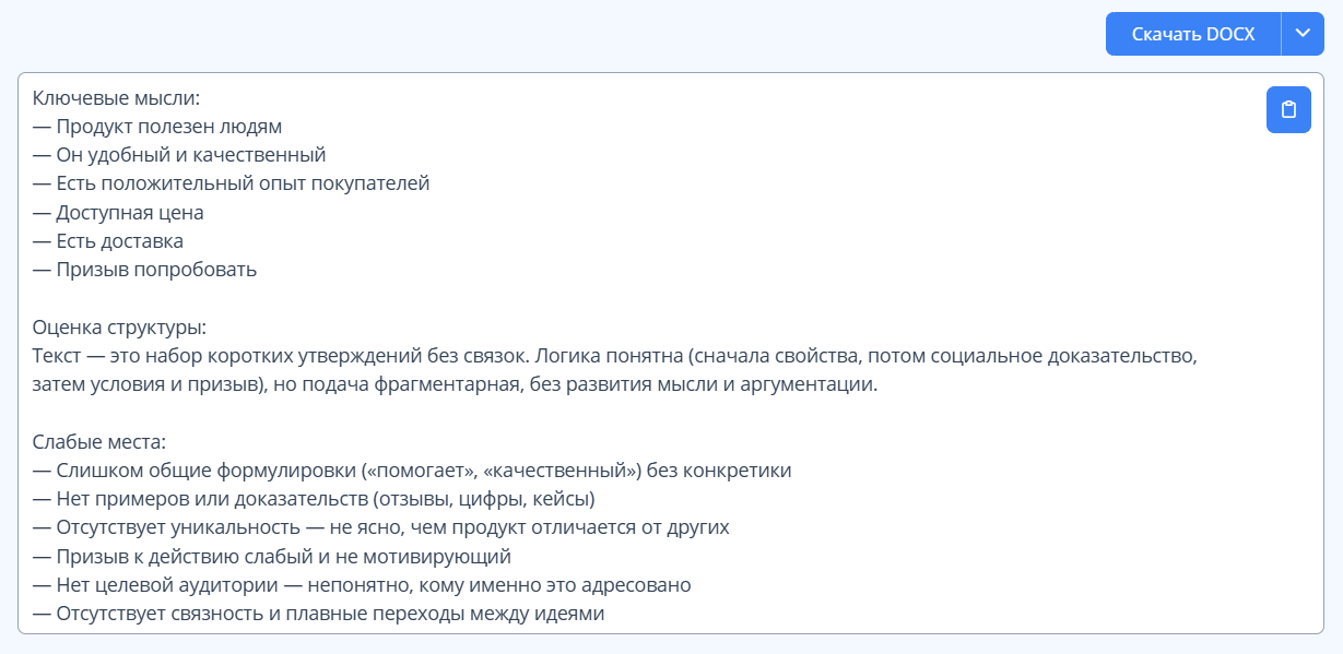 Проанализируй этот текст: выдели ключевые мысли, оцени структуру и укажи слабые места: