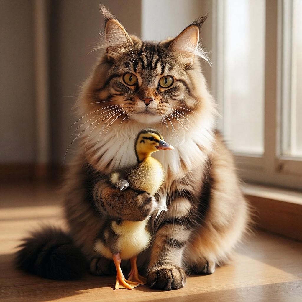 Кот нежно обнимает утенка, зажмуривается и улыбается от умиления. Камера медленно двигается вокруг них. К ним подходит мама-утка с тремя другими утятами и смотрит с беспокойством. Кот замечает ее, его улыбка медленно сменяется на виноватую и грустную. Он понимающе кивает, аккуратно отпускает утенка. Утенок радостно бежит к маме, и все утята уходят. Кот смотрит им вслед с теплой, немного грустной улыбкой. Стиль:реалистичный, мягкое освещение