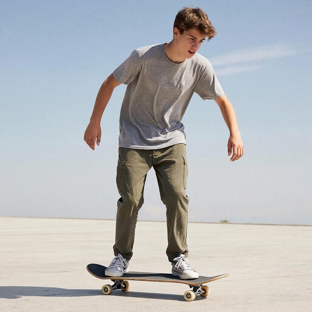 Зацикленное видео, профессиональный трюк на скейтборде. Молодой человек в серой футболке и штанах карго на огромной бетонной площадке. Он резко делает олли (прыжок с доской), скейтборд четко прилипает к его кедам в воздухе, а затем он мягко и точно приземляется в ту же стойку. Все происходит в одном непрерывном, плавном движении. Задний план — только небо и бетон. Четкий, динамичный, стиль скейт-видео 90-х