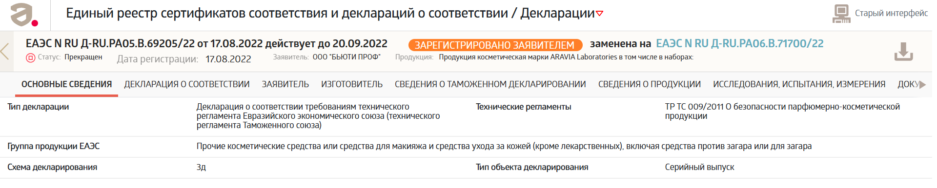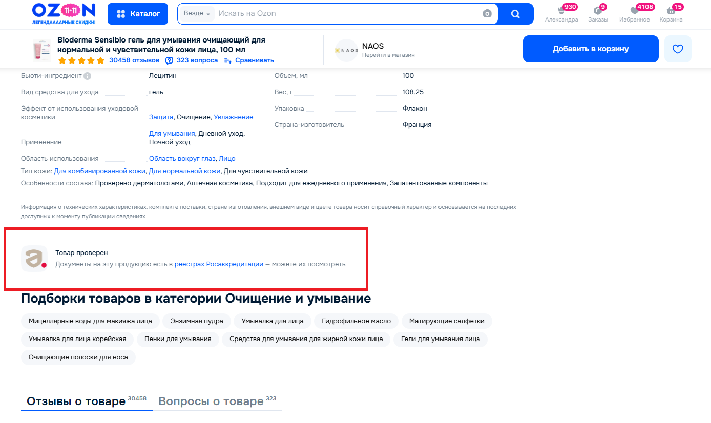 Блок «Товар проверен» → ссылка «реестры Росаккредитации» ведет в Единый реестр (pub.fsa.gov.ru). В нашем примере тут размещена разрешительная документация согласно техрегламенту ТР ТС 009/2011.