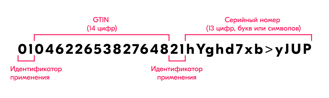 Код маркировки индивидуален для каждого товара и состоит из кода идентификации (GTIN) и криптохвоста от 4 до 88 символов. GTIN представляет собой уникальный номер товара, а криптохвост — дополнительную защиту для проверки подлинности.