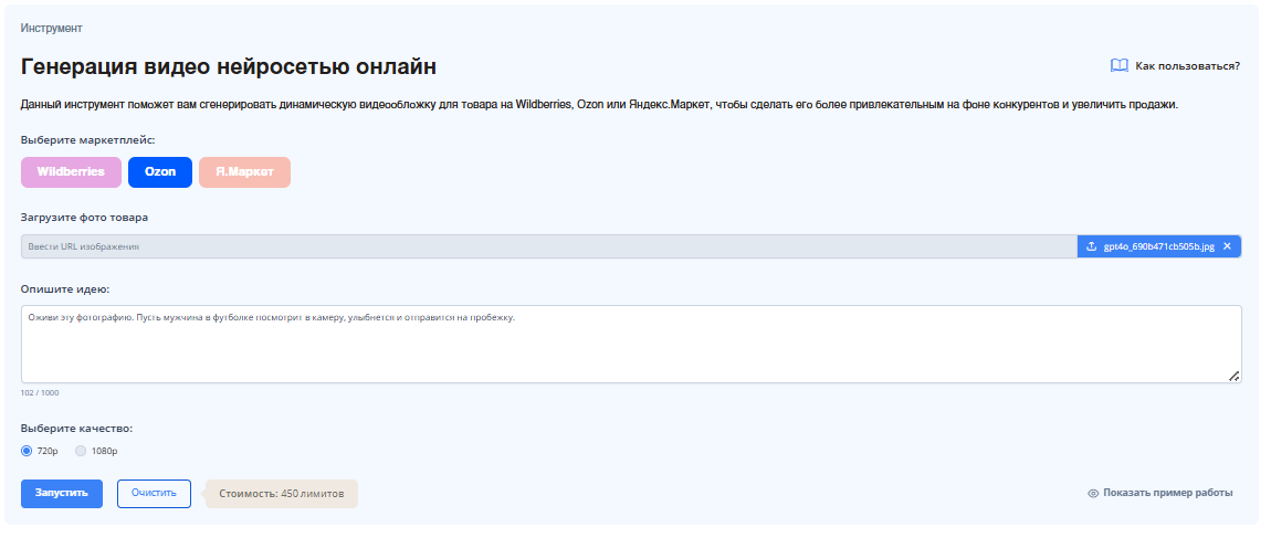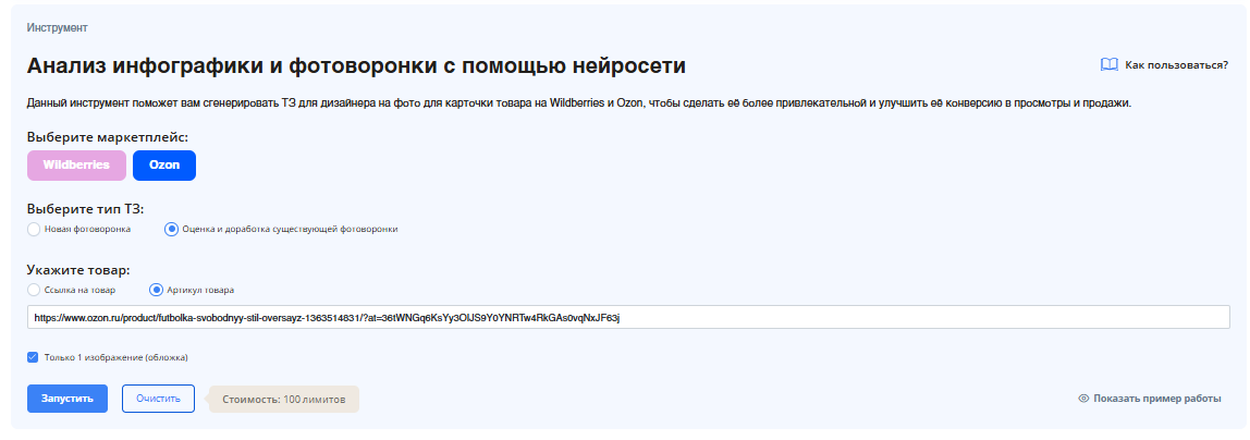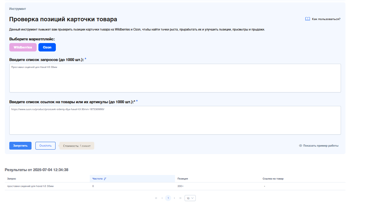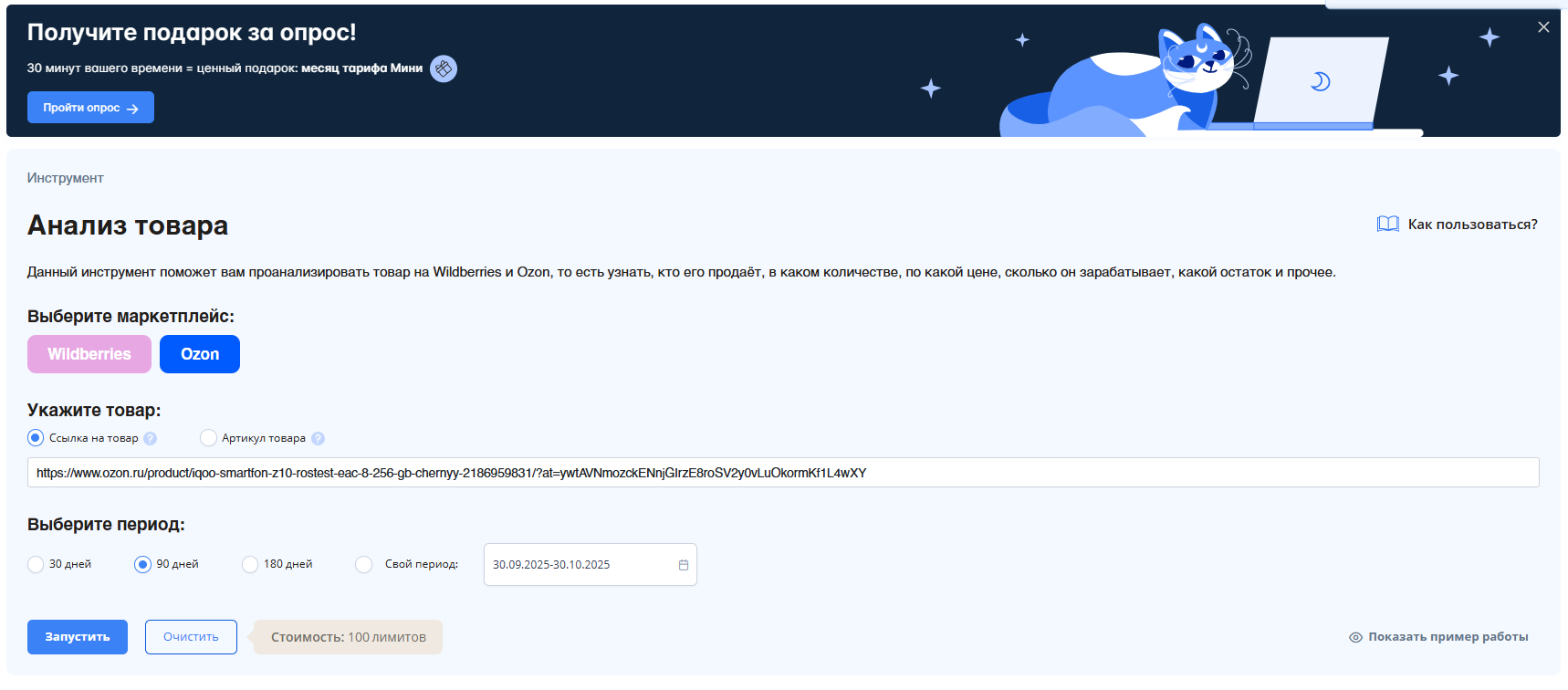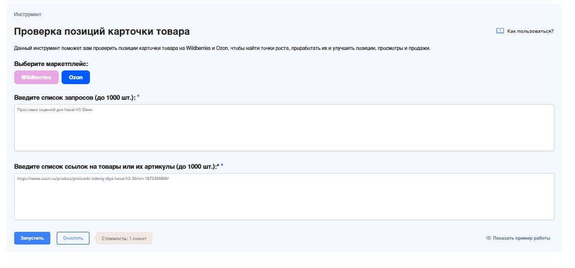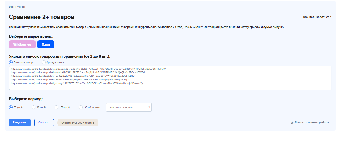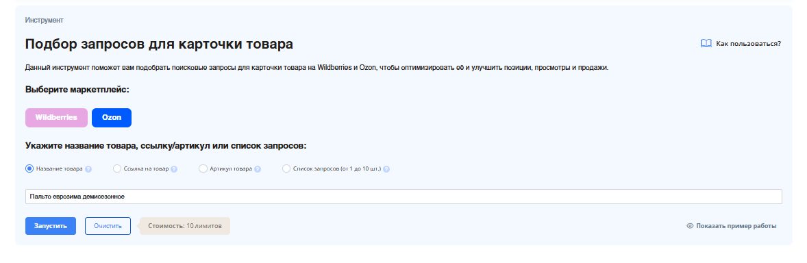1. Запускаем анализ. В интерфейсе инструмента выбираем маркетплейс Ozon и вводим в поле название товара. Нажимаем «Запустить».