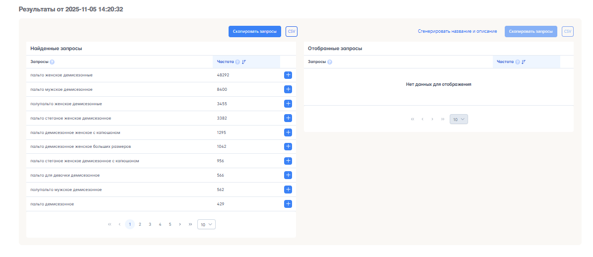 Мы отобрали ключевые запросы: [пальто женское демисезонное], [пальто демисезонное пальто еврозима женское], [пальто длинное женское демисезонное] и [пальто еврозима женское].