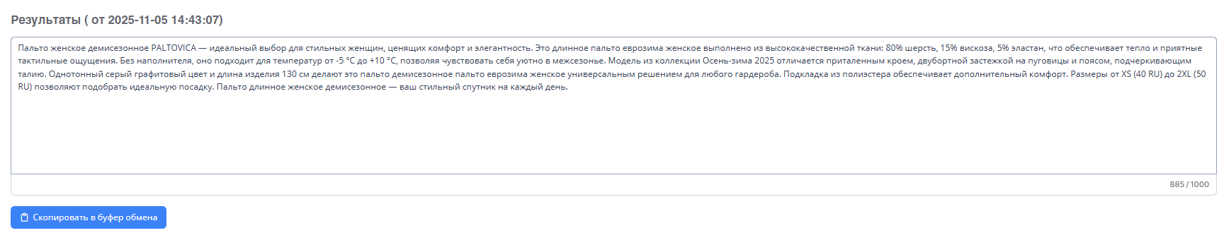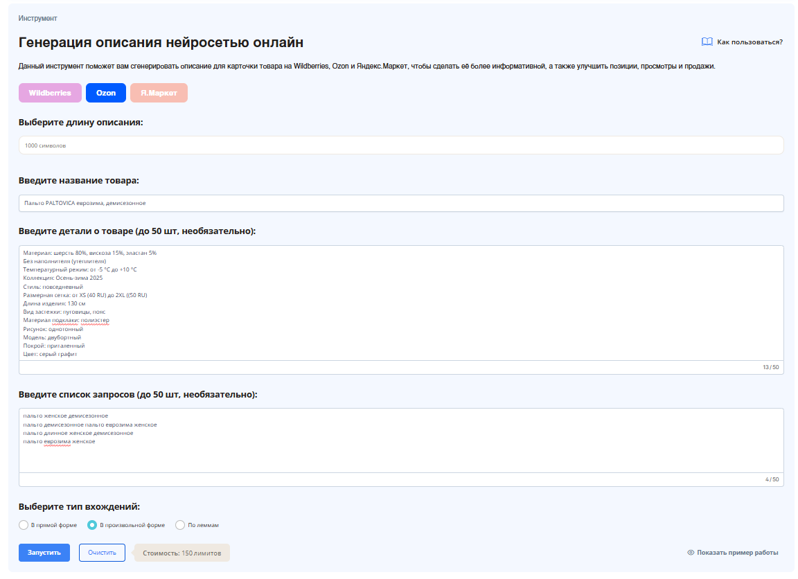После того, как форма заполнена, нажимаем «Запустить». Нейросеть создаст SEO-описание, органично внедрив в текст все ключевые фразы.