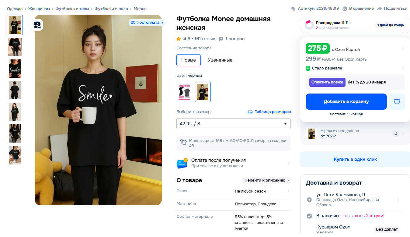 - Примеры использования (lifestyle-фото). Фото в соответствующей обстановке (для футболки — дома, на улице, в кафе, на прогулке). Помогает создать эмоциональную связь с покупателем.