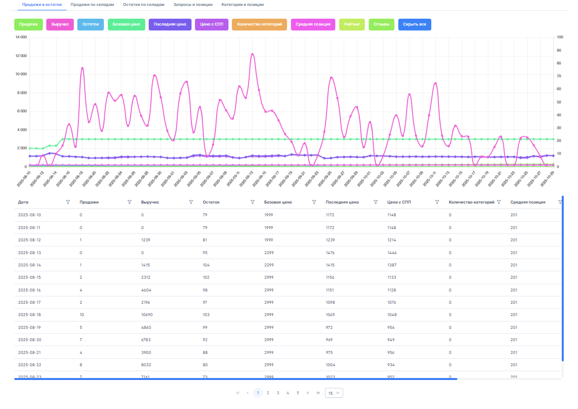 - Анализ товаров и конкурентов — глубокий анализ цен, остатков и динамики продаж.