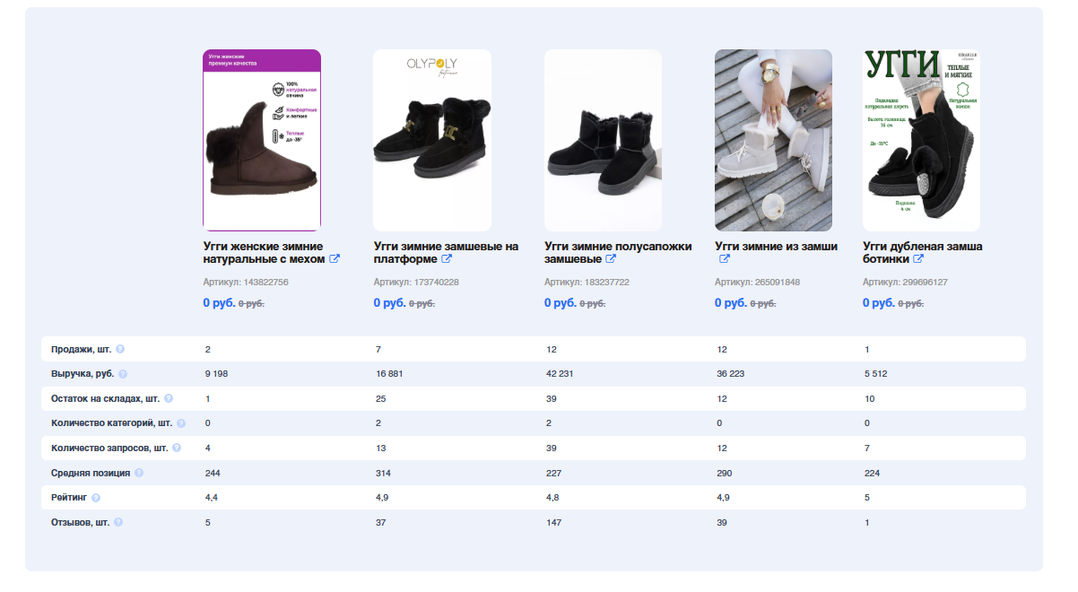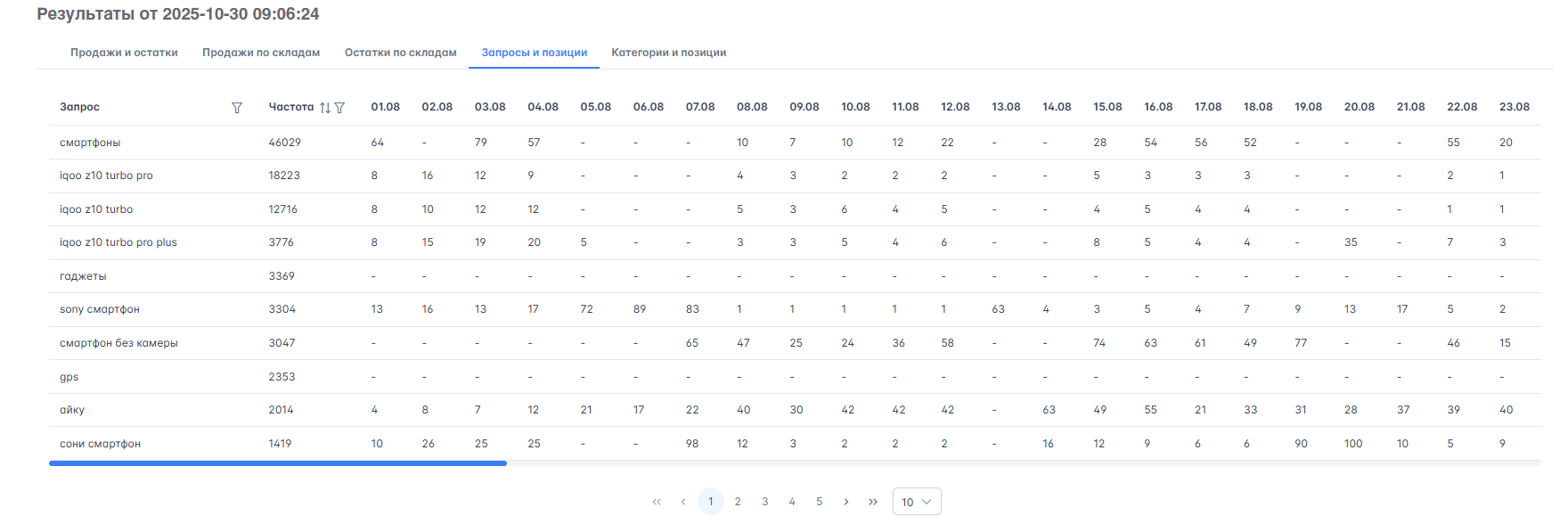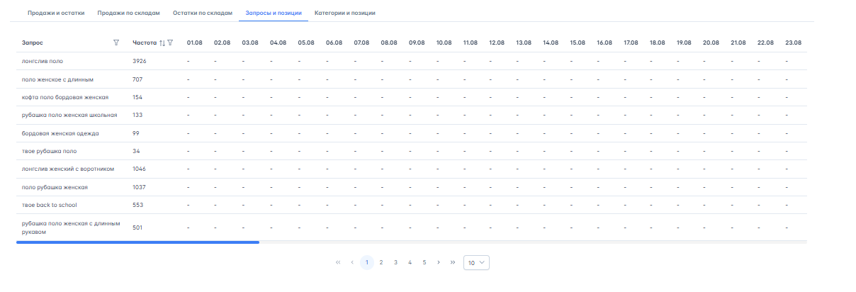 - Позицию по запросам: на какой строчке в поиске находится ваш товар по основным поисковым фразам.