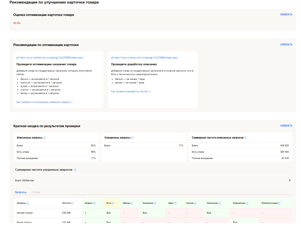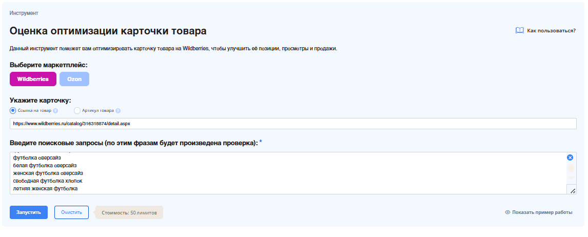 - Оценка оптимизации карточки — получайте персональные рекомендации по улучшению заголовка, описания и визуала.