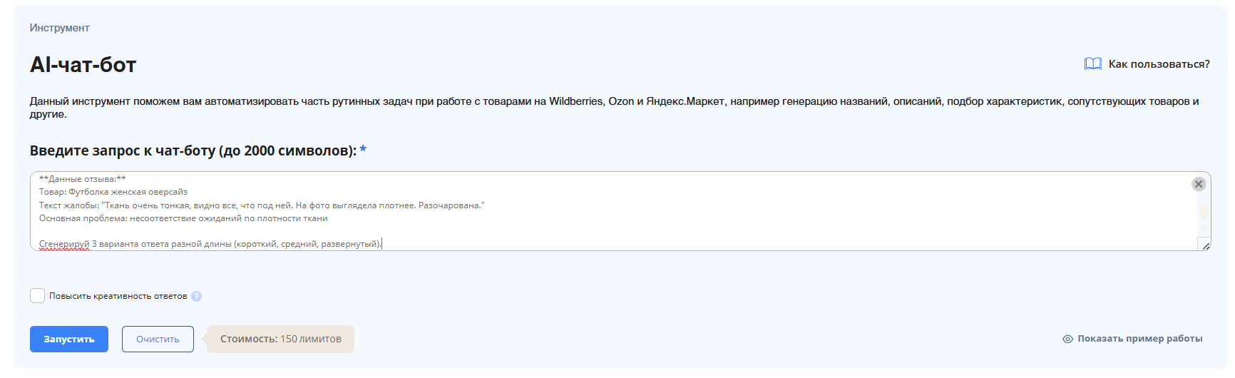 - AI-чат-бот — автоматизируйте работу с отзывами и вопросами.