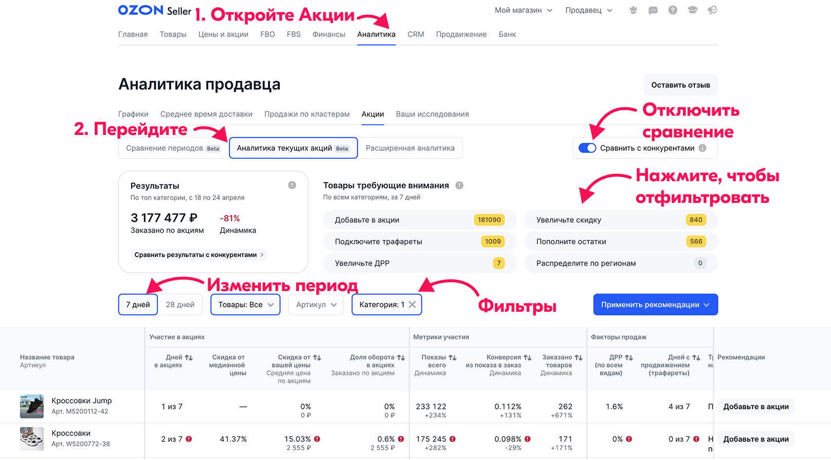 - Рекомендации Ozon: система автоматически подсказывает, какому товару нужна акция или увеличение скидки для роста продаж.