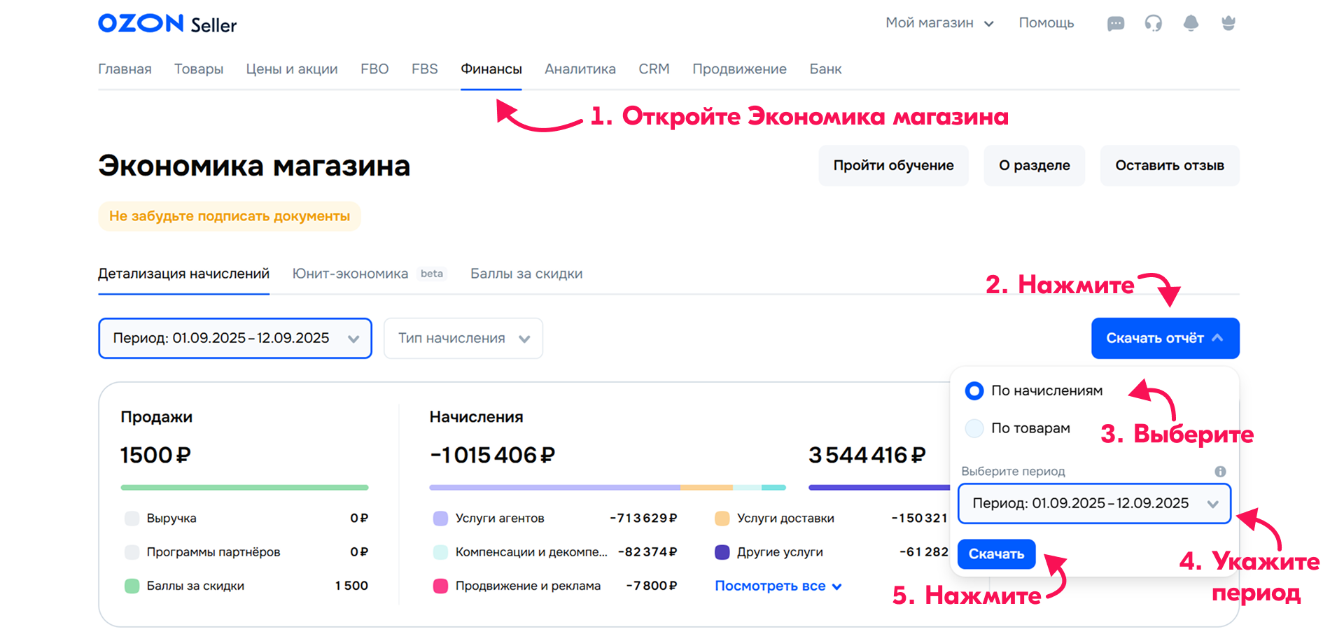 Отчёт по начислениям (Экономика магазина): детализация всех начислений и удержаний (комиссии, логистика, штрафы). Позволяет точно оценить чистую прибыль с каждого товара.
