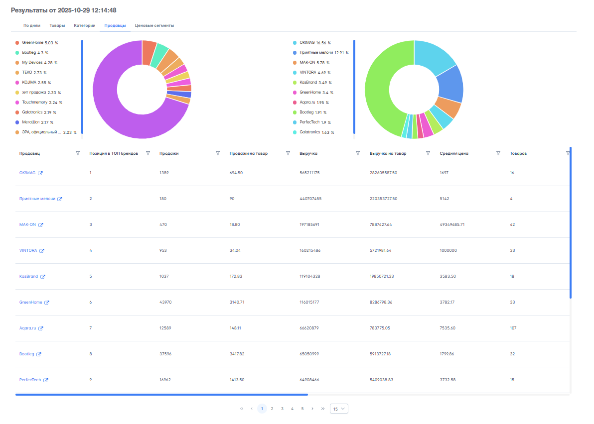 - Уровень конкуренции: инструмент покажет, сколько продавцов и брендов делят этот рынок. Критически важный показатель — % товаров с продажами. Если он низкий (например, 30%), значит, 70% предложений не находят покупателя — рынок переполнен или есть проблемы с качеством.