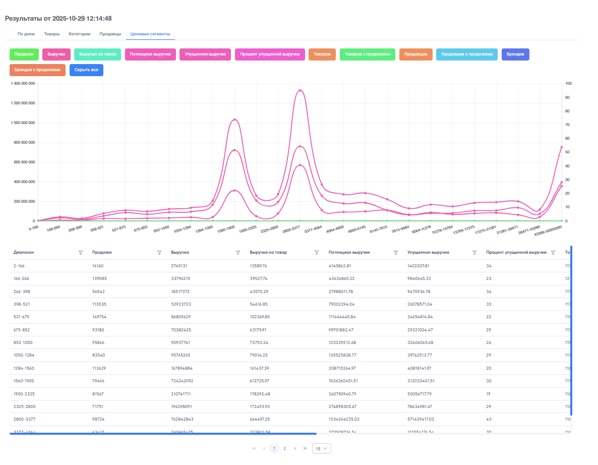 - Цена: Средняя цена — 2 100 руб., но есть активный кластер товаров по 5 500 руб. с хорошими продажами.