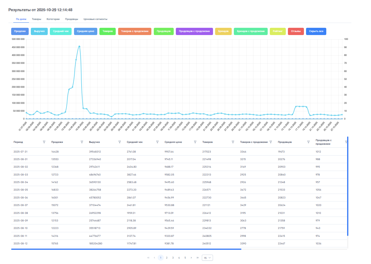 - Реальный спрос: не просто «частота запроса», а точные цифры — сколько штук было продано за последний месяц и на какую сумму. Например, отчет покажет: «Выручка: 18,5 млн руб., Продажи: 2,100 шт.».