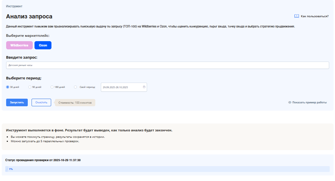 Допустим, вы думаете добавить в ассортимент «умные часы для детей». Вместо того чтобы просто закупать партию, вы вводите этот запрос в инструмент и за 100 лимитов получаете готовый анализ.