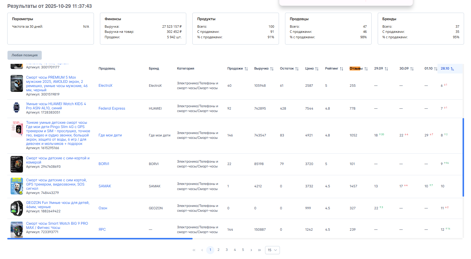 - Проверка позиций карточек — отслеживайте, на каком месте в поиске Ozon находится ваш товар, и оперативно реагируйте на изменения.