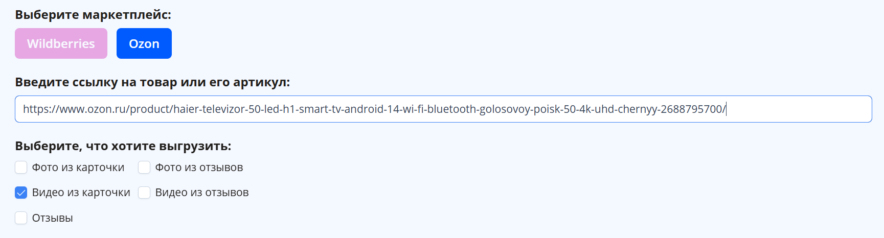 С помощью онлайн-инструмента от SELLER MOON можно скачать видео товара по ссылке на карточку. Система находит доступные материалы и подготавливает их для загрузки.