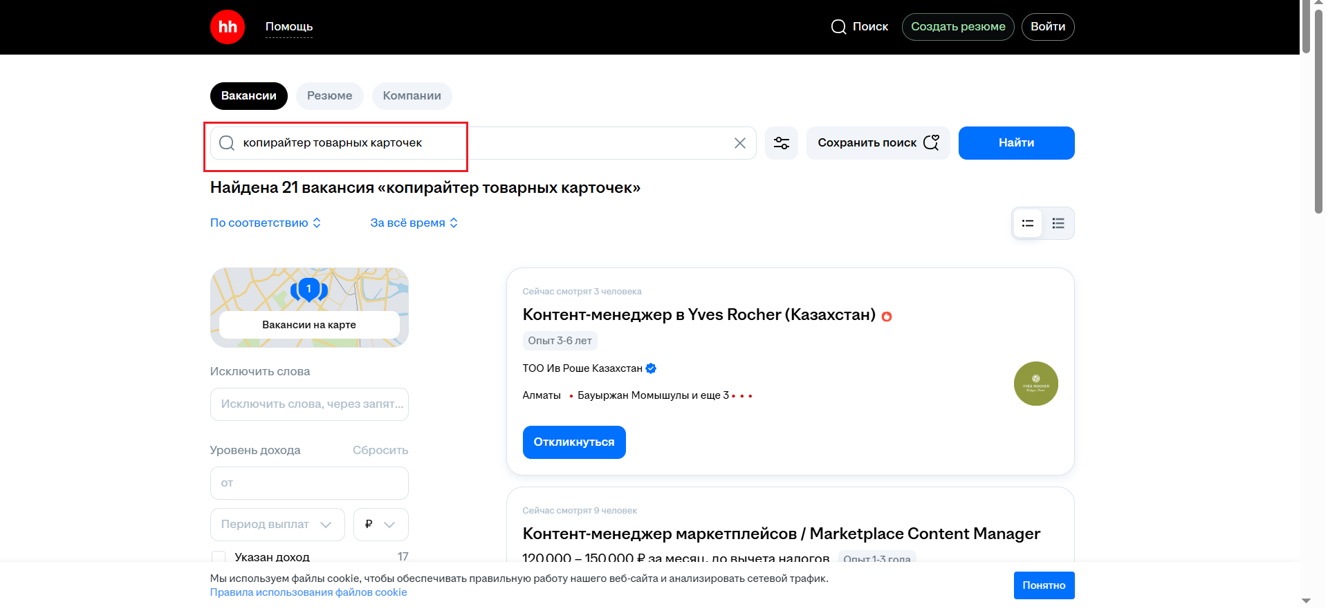 - Сайты по поиску работы (HeadHunter, Работа.ру) — здесь публикуются вакансии компании, которым нужен менеджер для регулярной работы с карточками. Соискатели могут найти как проектный, так и полноценный удаленный формат.