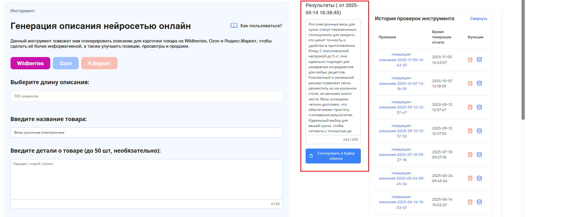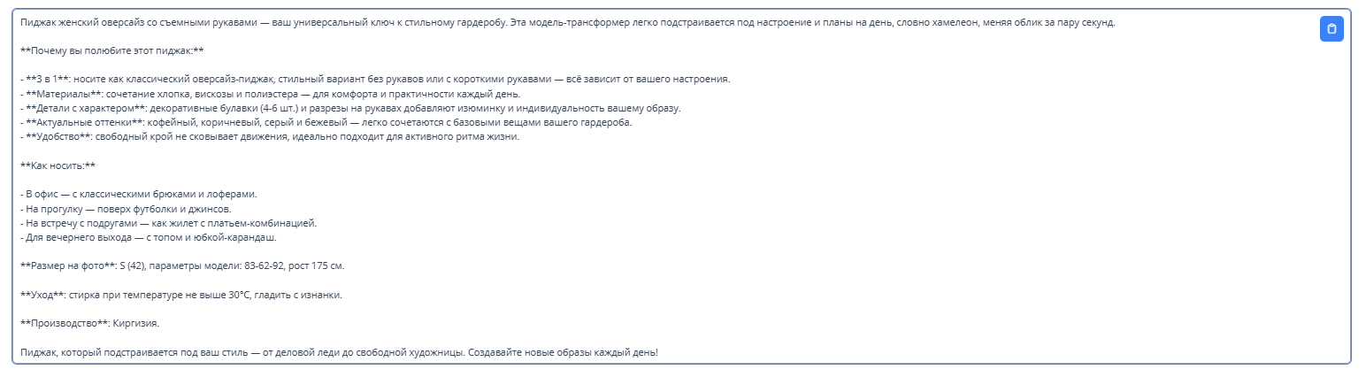 - Описание. Структурируйте текст, начиная с главных преимуществ. Разбейте на блоки: «Что это», «Преимущества», «Характеристики», «Комплектация», «Для кого». Для автоматического создания качественного SEO-текста можно использовать AI-чат-бот или «Генерация описания нейросетью онлайн» от SELLER MOON. Задайте промпт с ключевыми словами и характеристиками товара. Получите структурированное описание, которое останется лишь адаптировать.