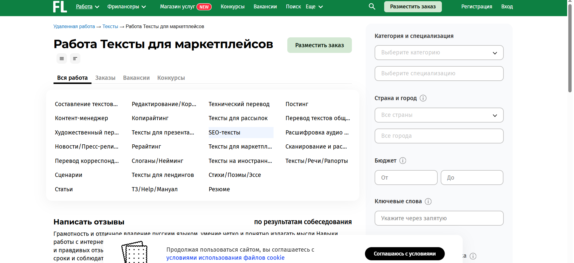 Например, на FL.ru есть профильный раздел «Работа» → «Тексты для маркетплейсов». На этой площадке клиенты периодически размещают профильные задачи по написанию текстов для товаров и отзывов на WB/Ozon.