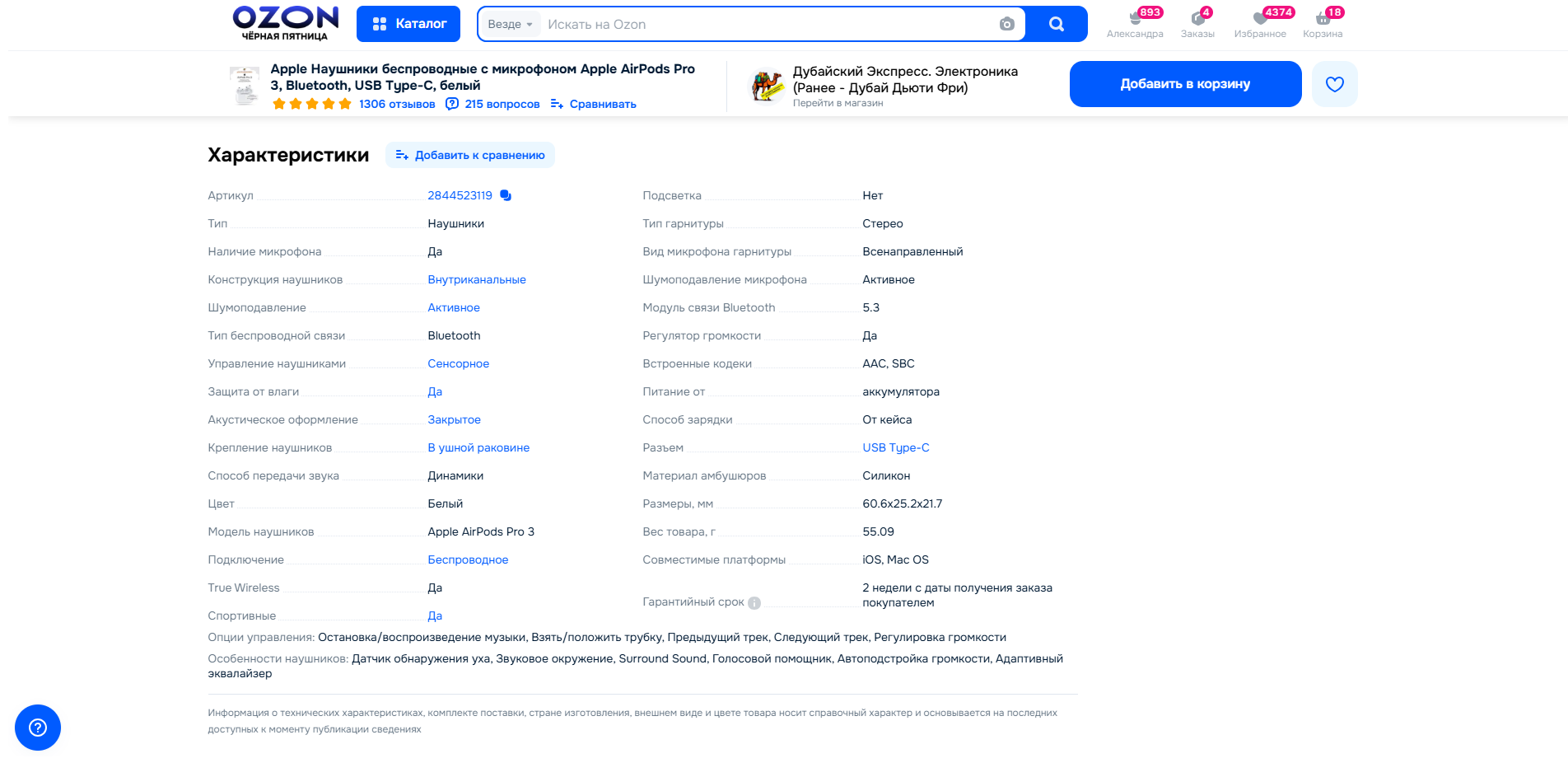 - Характеристики (атрибуты). Заполняйте все доступные поля максимально точно. Это основной способ попасть в фильтры, через которые идет до 60% трафика. Пример: