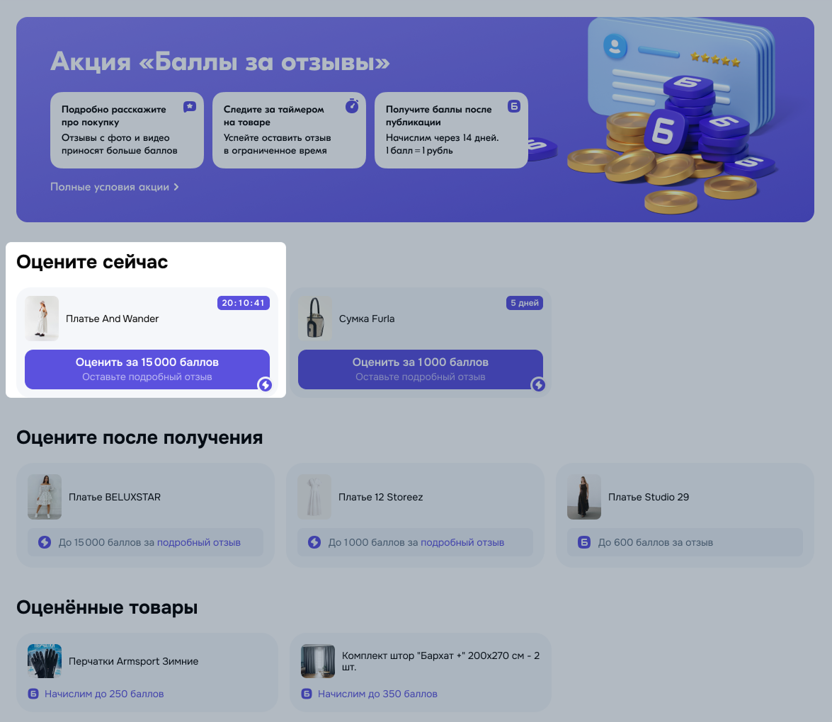 - Подключение товаров к акциям маркетплейса, программы «Баллы за отзыв» для повышения доверия, органического роста рейтинга.