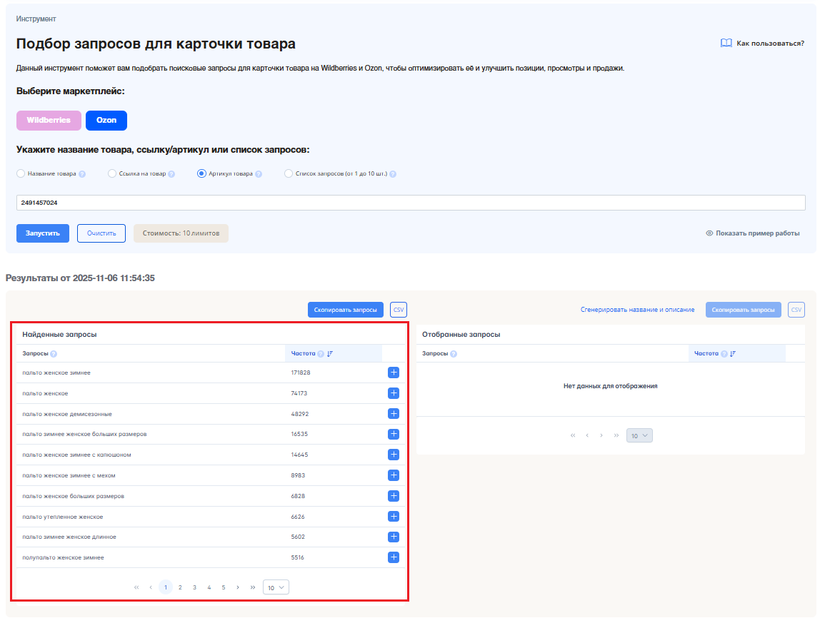 - Платные сервисы / нейросети — такие инструменты серьезно ускоряют процесс. Например, «Подбор запросов» анализирует Ozon и выдает список релевантных ключевых фраз с частотностью, что экономит часы ручной работы. Полученные ключи можно сразу использовать в следующем шаге.