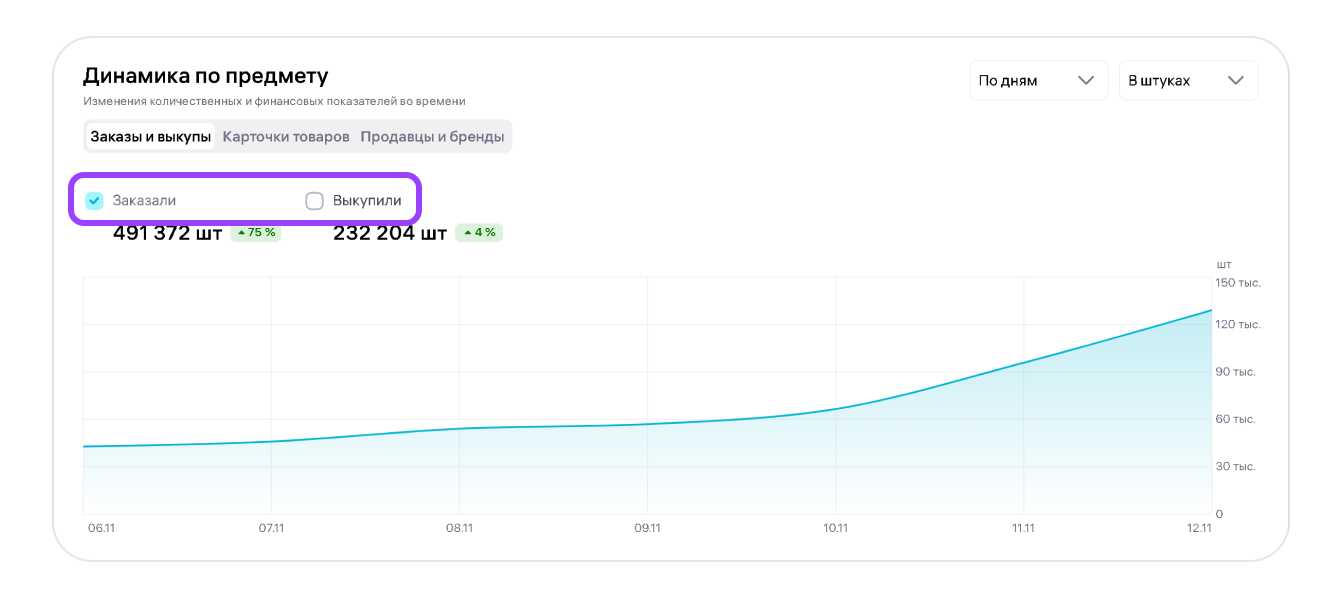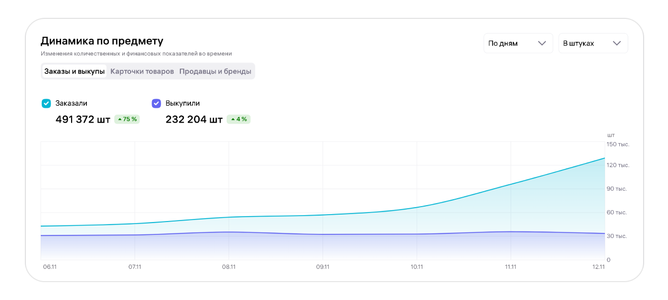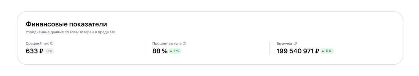 К этой категории метрик можно отнести выручку по нише, средний чек, а также процент выкупа.