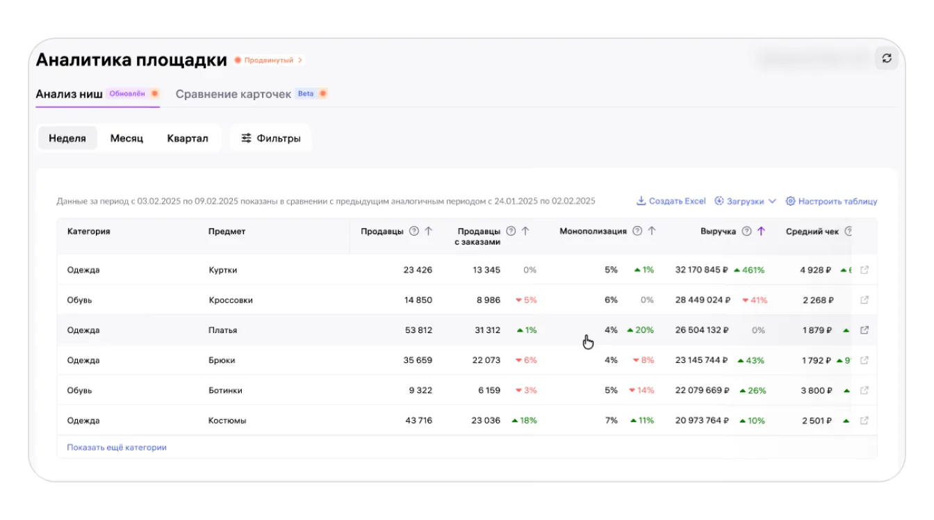 Отчёт из раздела «Аналитика площадки» помогает селлерам анализировать и находить новые ниши. Благодаря этому продавцы понимают, какие товары востребованы, а от реализации каких лучше отказаться.