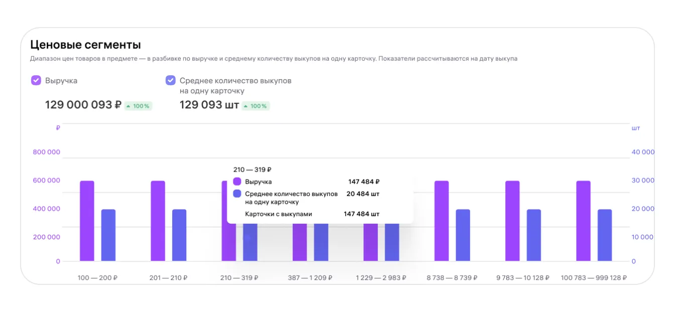Пример из практики: в нише «коврики для йоги» средний чек 2 500 руб. При этом анализ показал, что сегмент 4 000–6 000 руб. практически свободен — отличная возможность для премиум-позиционирования.