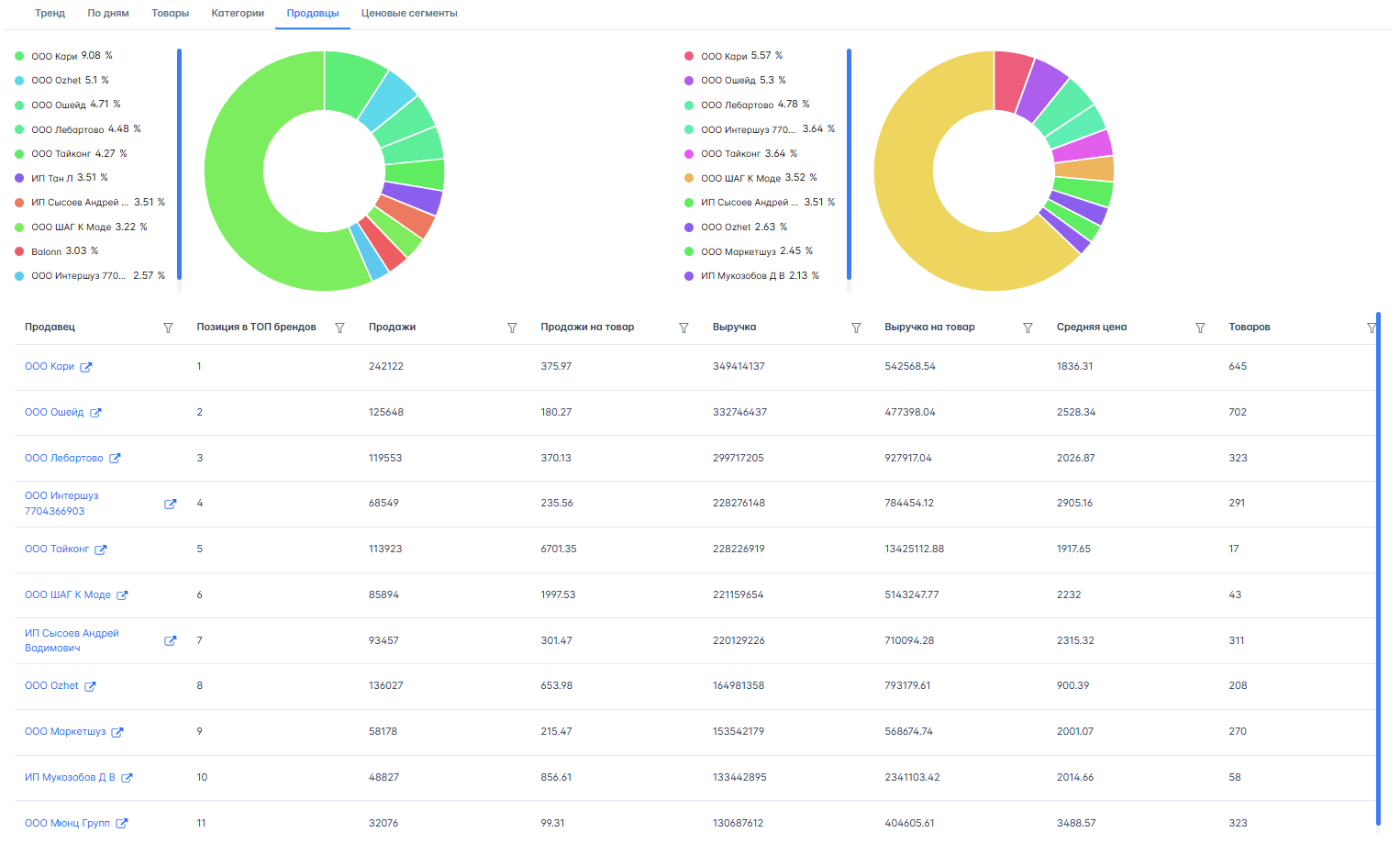 Сюда относятся количество продавцов, продавцы с заказами и монополизация.