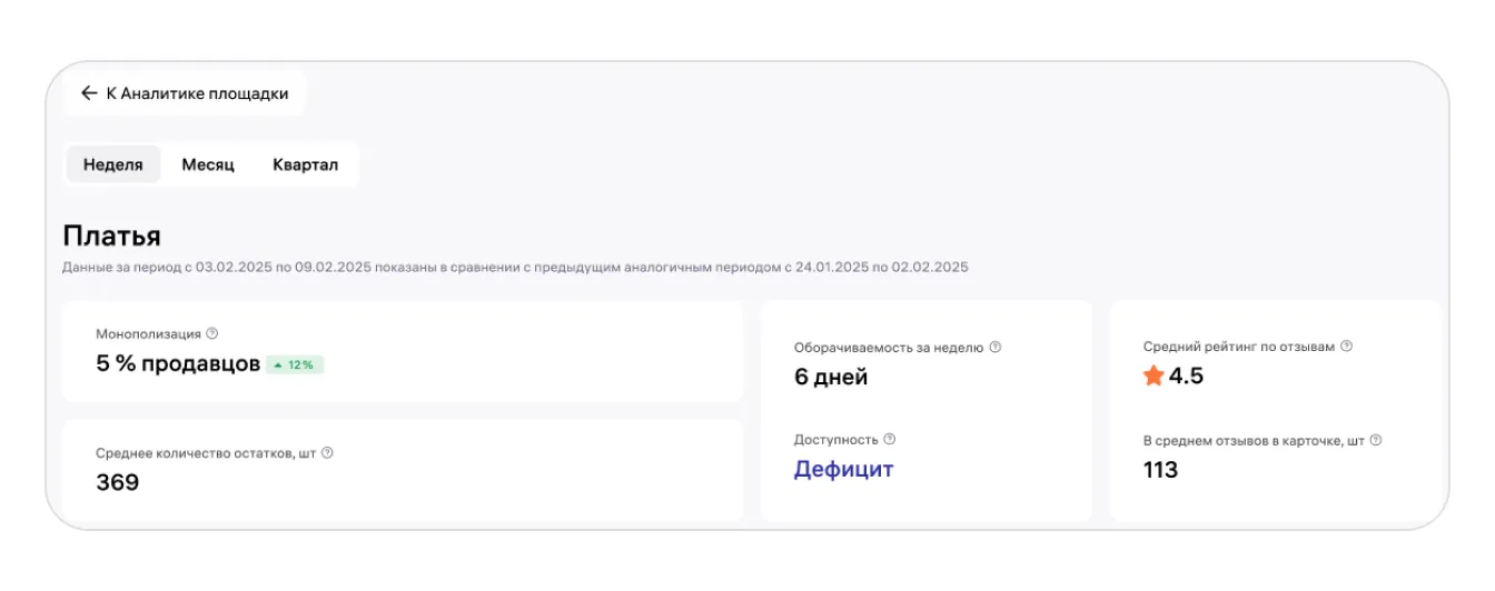 Переключатель вверху страницы позволяет устанавливать произвольный период (неделя, месяц, квартал), менять название предмета и блоки данных по монополизации, оборачиваемости, ср.остаткам (нулевые не учитываются), рейтингу товаров (отображаются только карточки с отзывами).