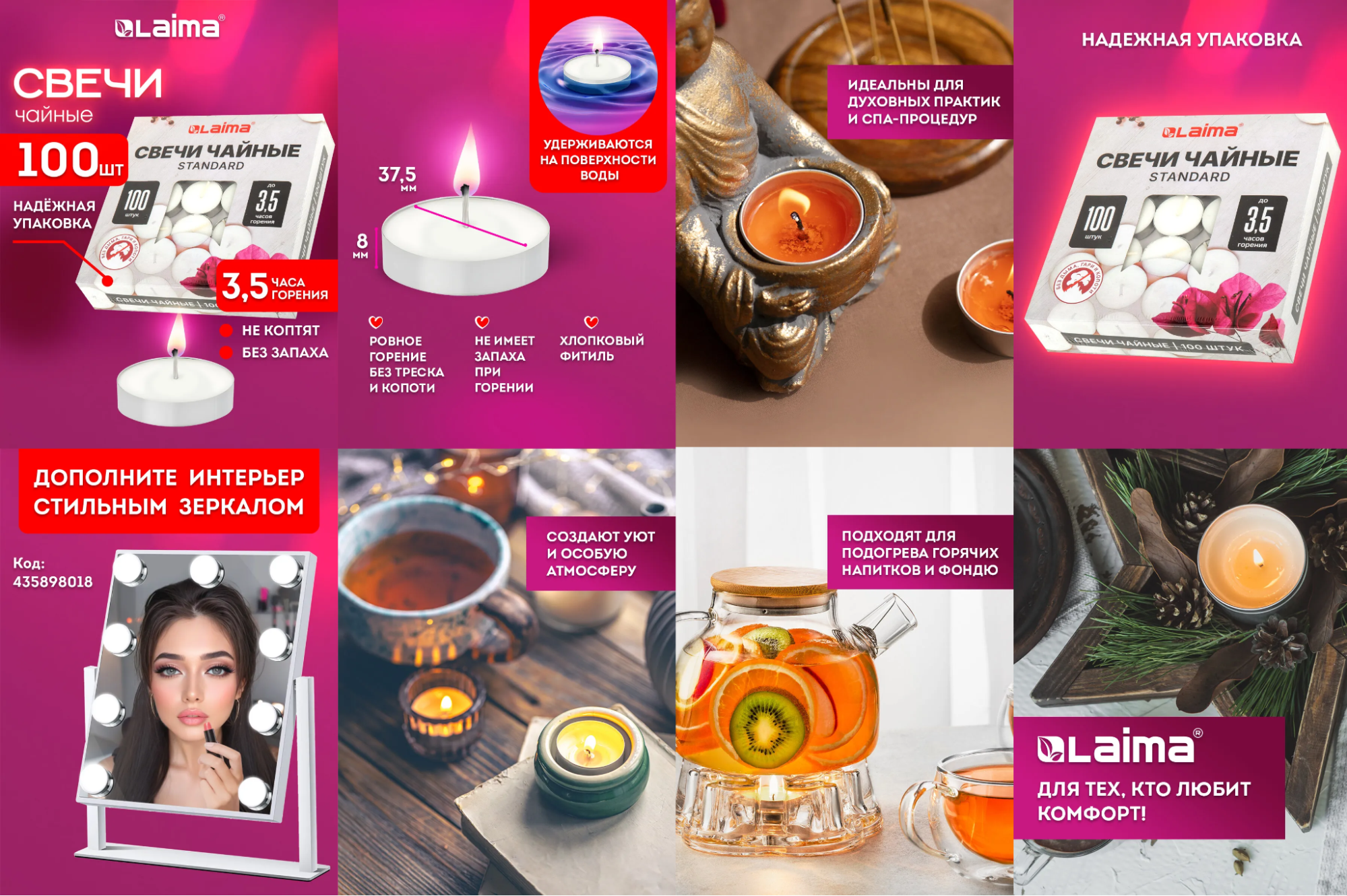 Общее описание: набор, расположенных аккуратно в коробке. Без запаха, мягкое освещение, акцент на чистоте, простоте, натуральности. Простые, без запаха, предназначены для создания уюта, спокойствия. Безопасный и экономичный вариант — 100 штук в упаковке.