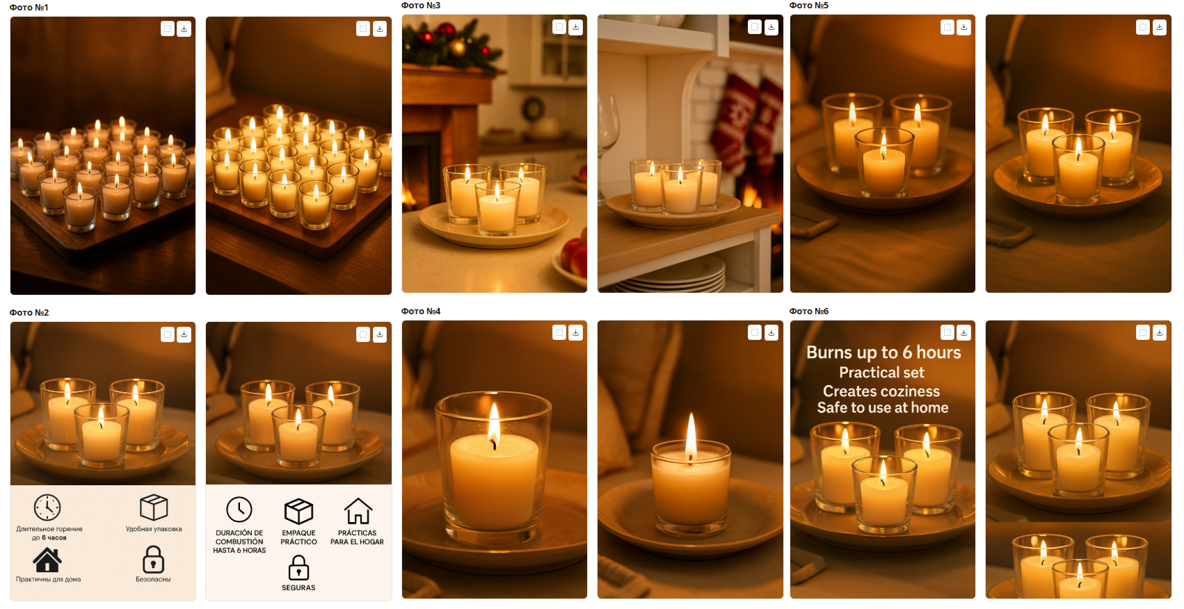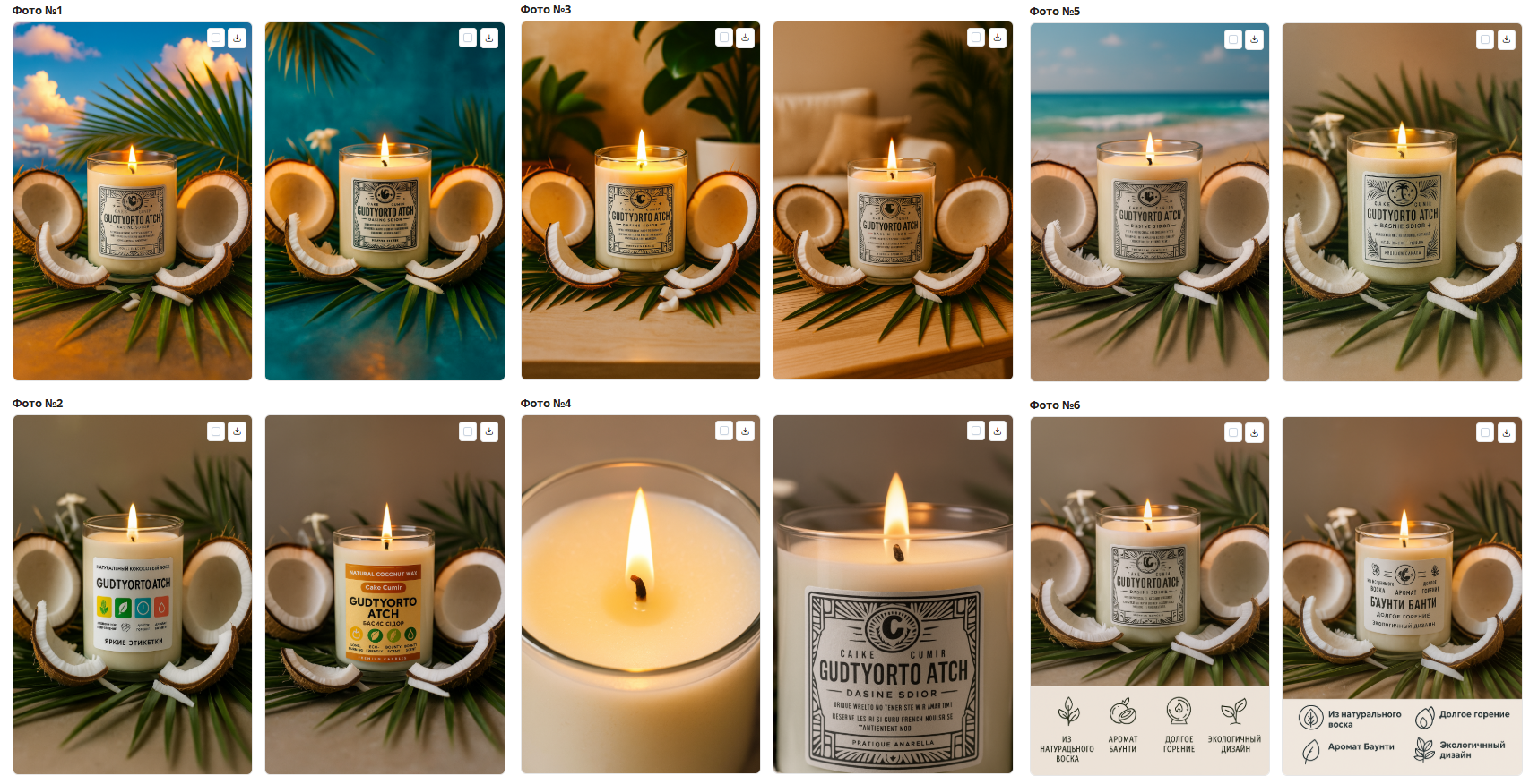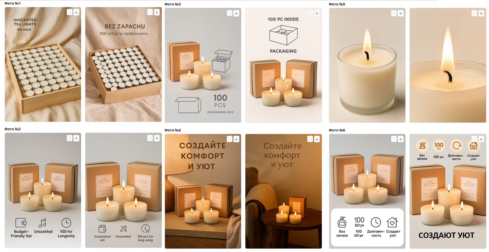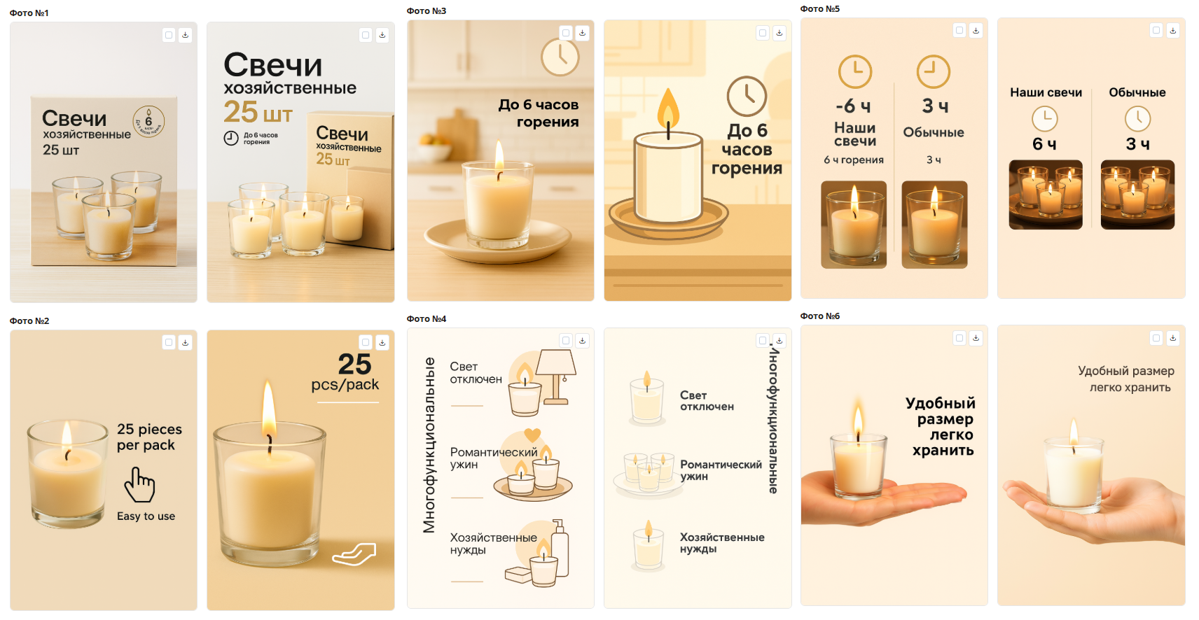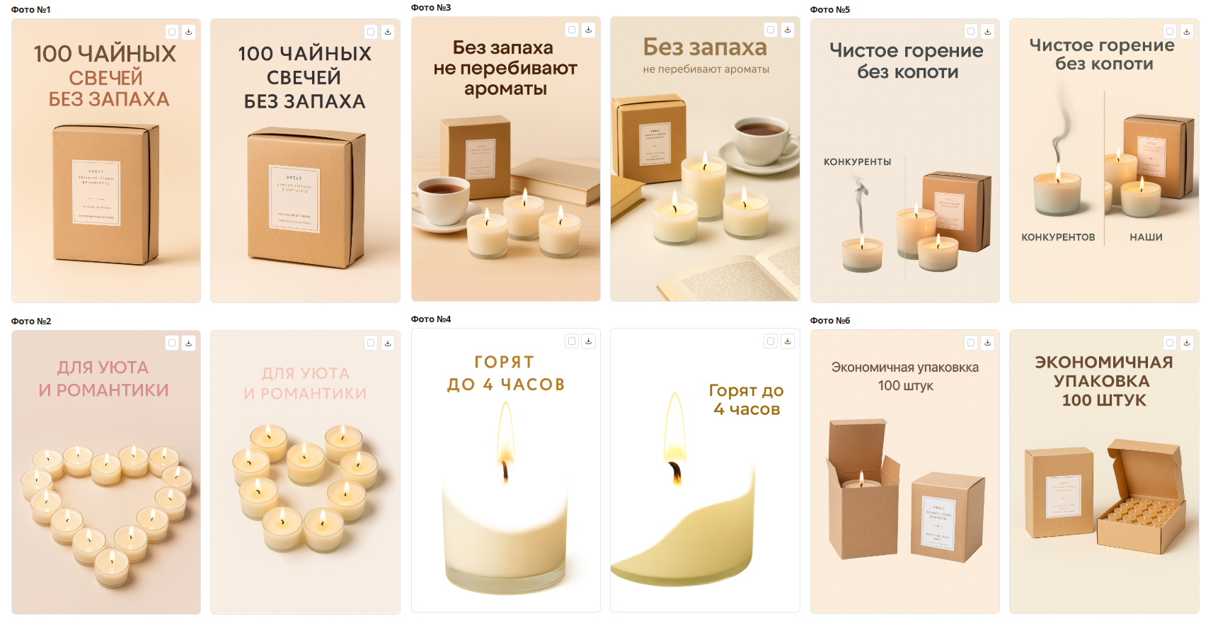 - Сообщайте ИИ особенности продукта: аромат, длительность горения, оформление, материал.