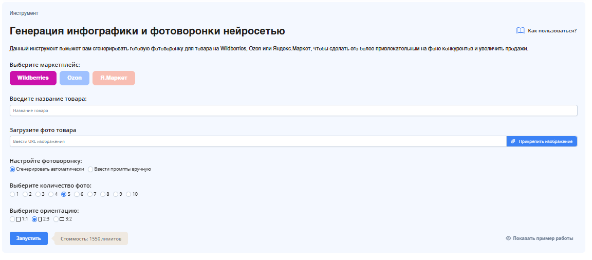 - Выбор режима генерации — автоматический или ручной (с точными промптами, не более 10 штук).