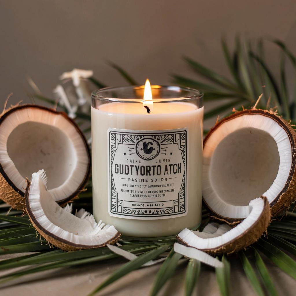 - <Стильная свеча Баунти из кокосового воска в стеклянной банке с этикеткой, на фоне натуральных листьев кокос на пляже. Тропический стиль, атмосфера отпуска. Горит мягким пламенем,. Цветовая палитра: яркие тона, теплое освещение>