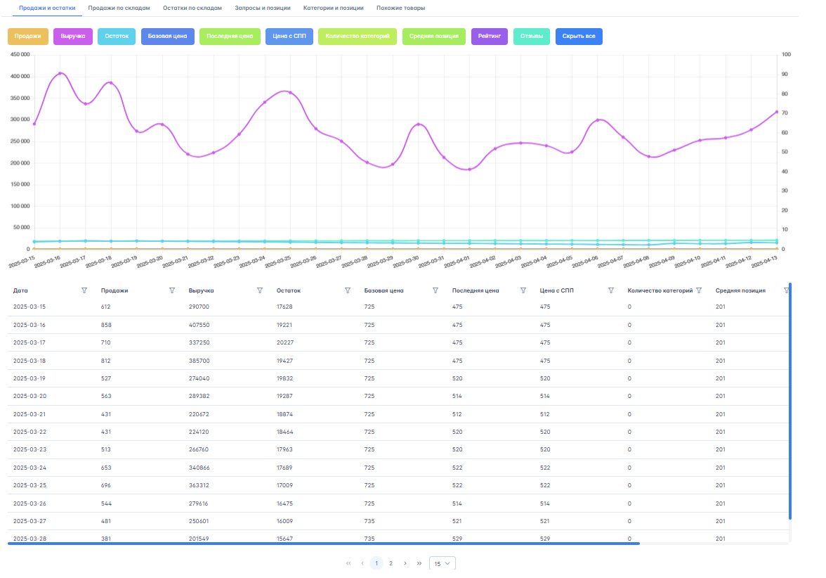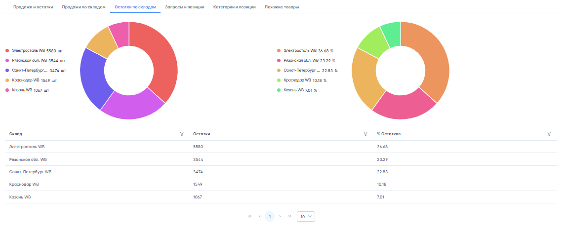 - Анализ товара — позволяет отслеживать динамику продаж и остатков по складам, чтобы выявлять общие тенденции и корректировать стратегии. Подробнее об инструменте рассказывали тут.