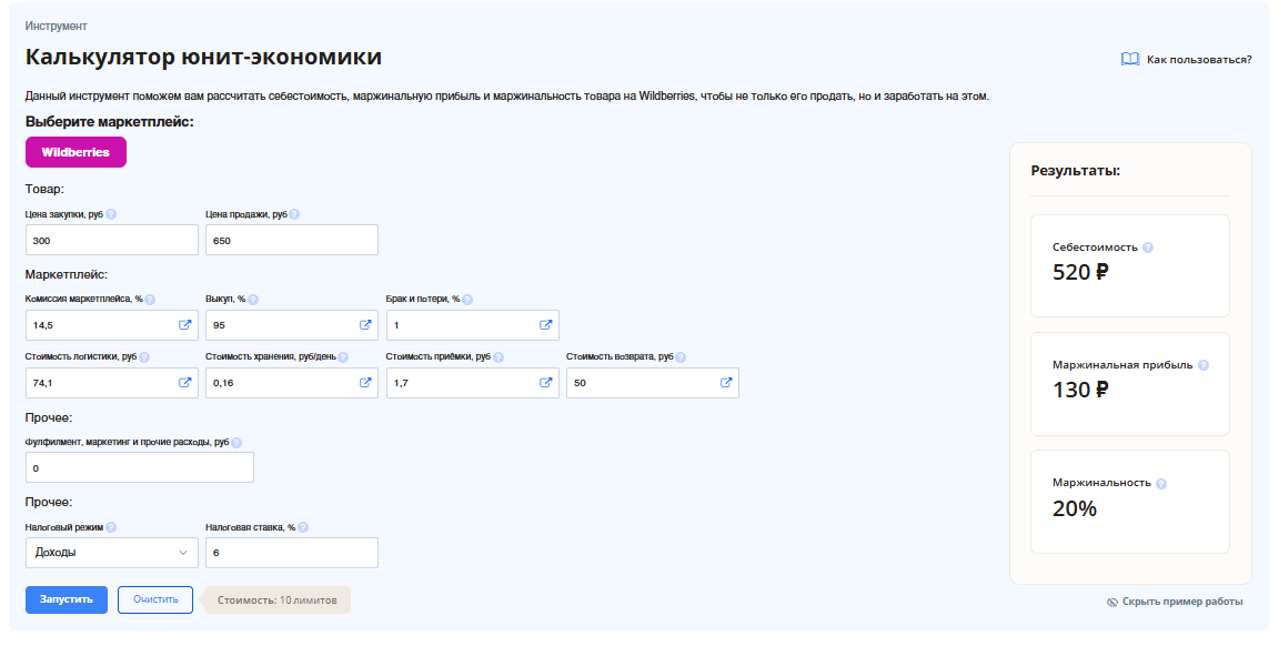 Внесите затраты на фулфилмент, маркетинг и другие расходы, не учтенные ранее. Выберите налоговый режим вашей организации и соответствующую налоговую ставку. После заполнения всех полей нажмите кнопку «Запустить» для расчета.