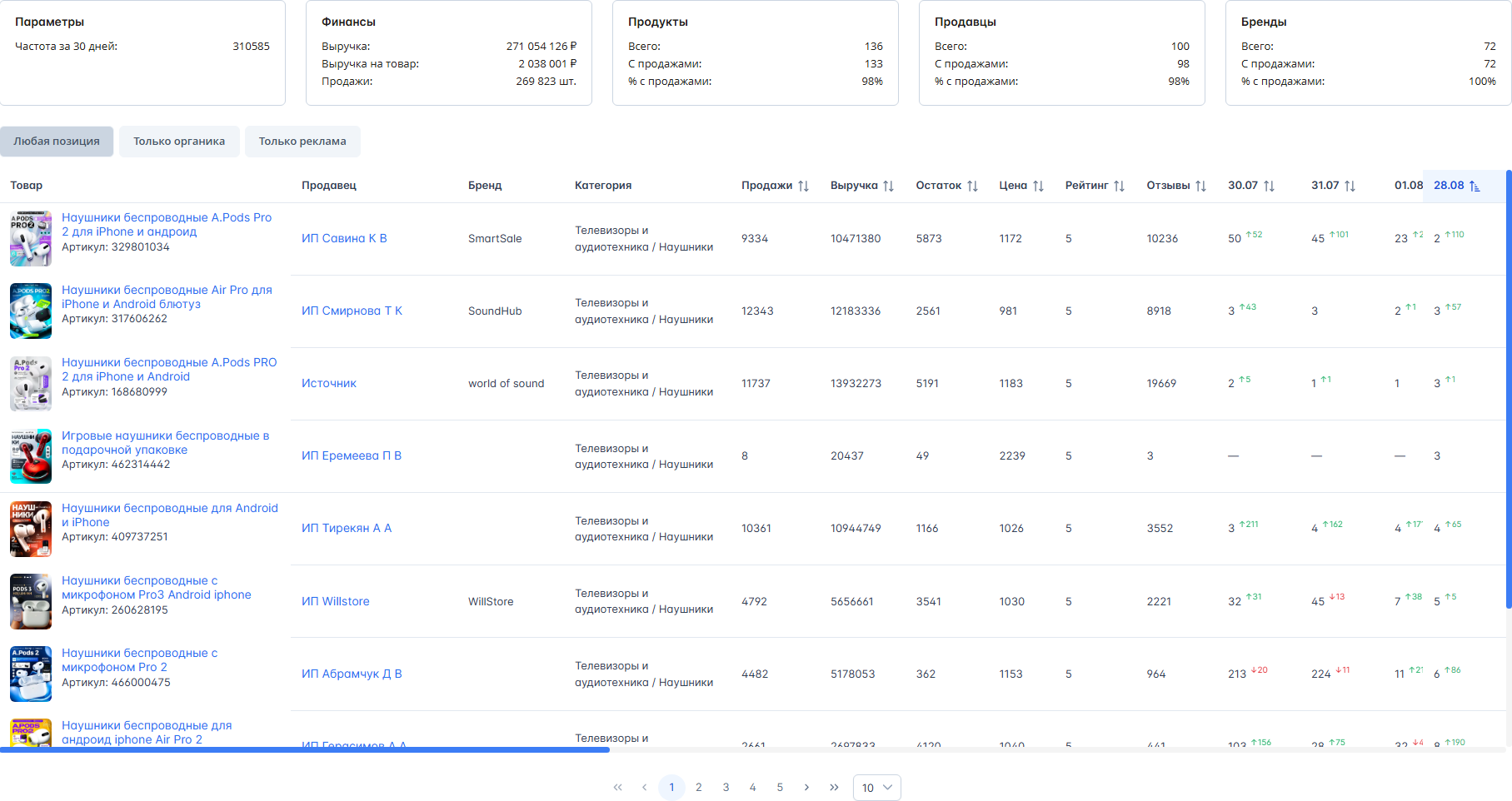 - Потенциал и конкуренция. Узнайте реальную частотность запроса, выручку и сколько продавцов уже борются за место в выдаче.