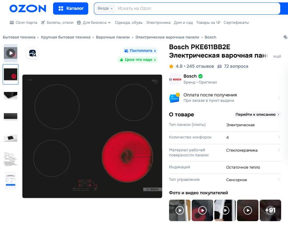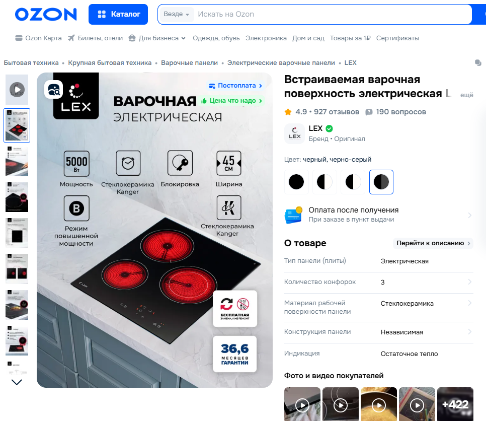 Карточка справа выглядит лучше благодаря демонстрации варочной поверхности на кухонном гарнитуре и наличию инфографики. CTR у нее выше, как и позиция в выдаче на OZON.